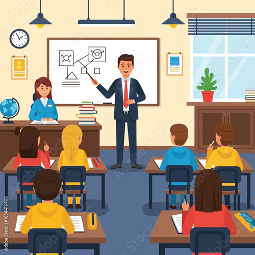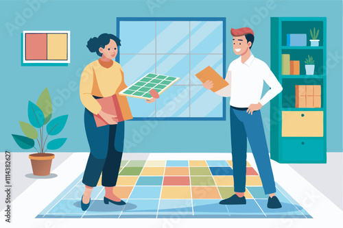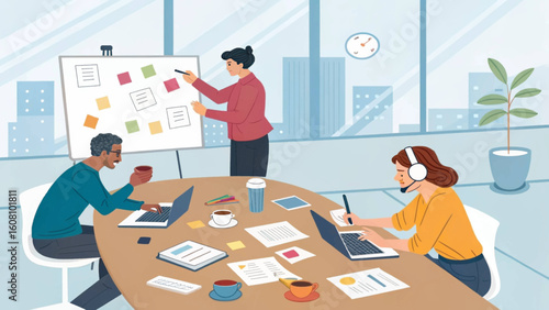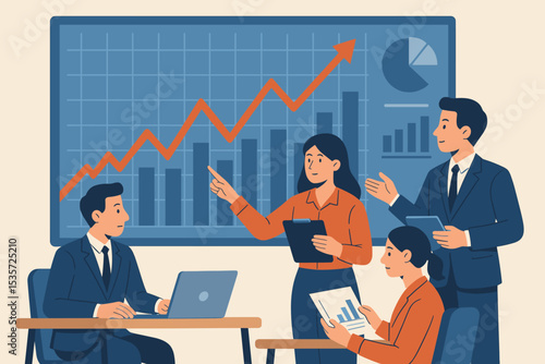 Moderátor vedení telefon výstavní akce na pult desk vektorové ilustrace. Nová elektronická prezentace produktů, uvedení digitálního zařízení a inteligentní technologické linky