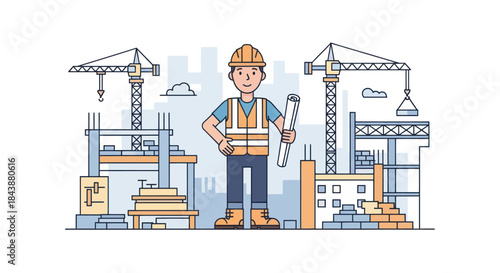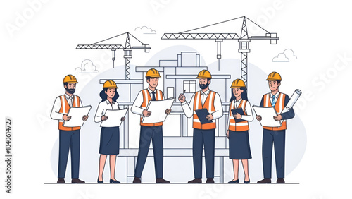 Profesionální stavební inženýři a architekti v helmách diskutující o architektonickém projektu moderních městských budov, ploché vektorové ilustrace. Dům stavební průmysl, stavební vývoj.
