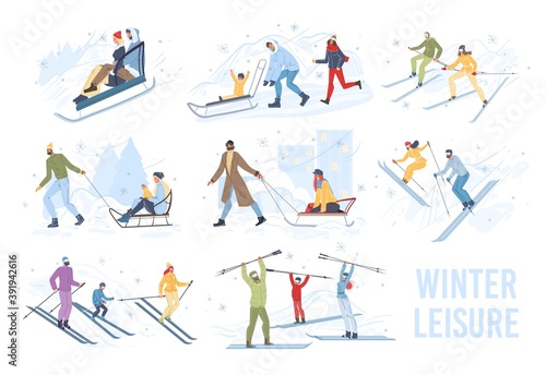 Profesionální domácí úklidové služby, vektorové ploché ilustrace. Mužské a ženské postavy, zaměstnanci úklidové společnosti vyzvedávající odpadky, mytí oken a podlahy v obývacím pokoji.