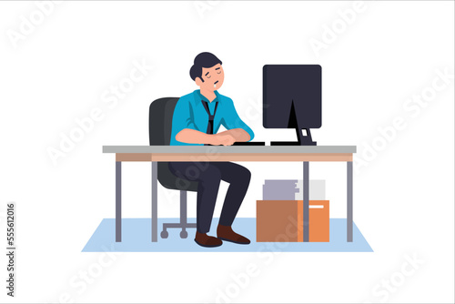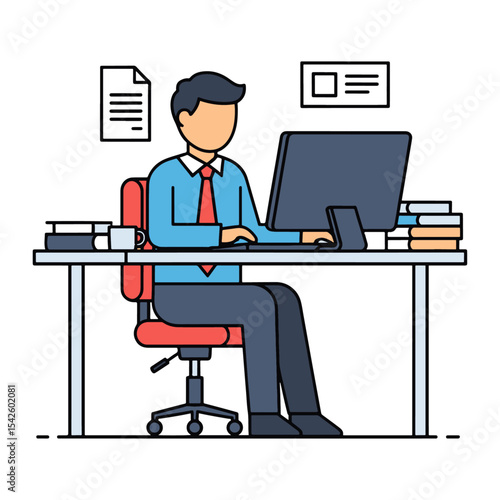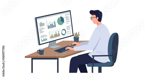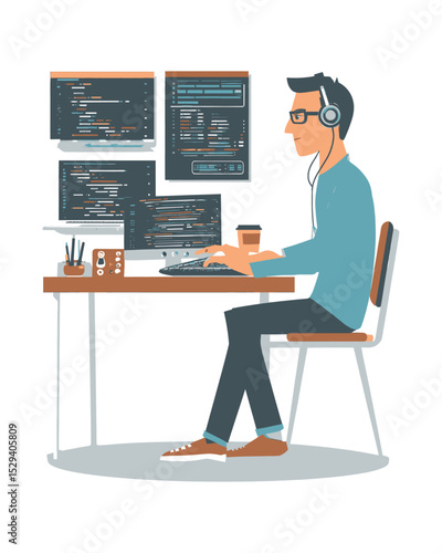 Vektorová ilustrace správce systému mladého muže nebo programátora pracujícího na počítači. Kreativní tým lidí plochý styl designový prvek, ikona izolované na bílém pozadí.
