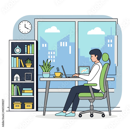 Vektorové ilustrace správce systému mladého muže pracující na počítači. Programátor, kreativní člen týmu concept plochý styl designový prvek.