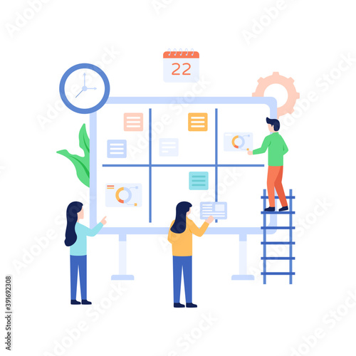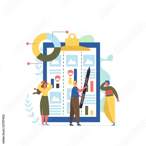 Projektové řízení, vektorový plochý design ilustrace. Velká schránka, drobní lidé. Plánování, řízení, spolupráce, řízení týmu a koncepce organizačního procesu pro webový banner, webovou stránku.