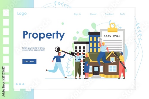 Šablona webových stránek vektorů vlastností, design webových stránek a vstupních stránek pro vývoj webových stránek a mobilních stránek. Realitní kanceláře a zákazníci, kteří kupují prodej nebo pronájem domů.