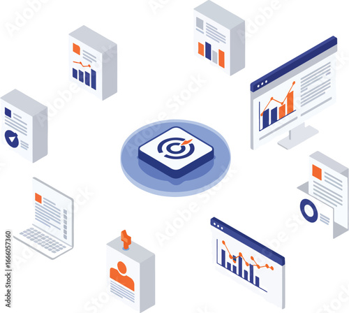 Šablona vývojového diagramu zpráv o ochraně. Vektorové izometrické grafy a grafy spojené s ochranným a bezpečnostním symbolem spojovacími čarami.