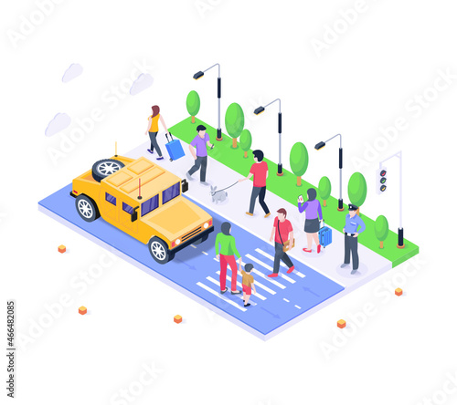 Hořící policejní auto, aktivisté s hořícími pochodněmi, transparent, Megafon, ploché vektorové izometrické ilustrace. Protestní akce. Násilné veřejné nepokoje, občanské nepokoje, pouliční nepokoje.