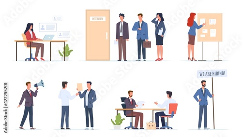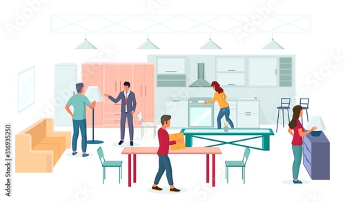 Prodavač pomáhá nakupujícím mužským a ženským postavám vybrat si nábytek do interiéru kuchyně a obývacího pokoje, ploché vektorové ilustrace. Složení obchodu s nábytkem pro webový banner, webová stránka.