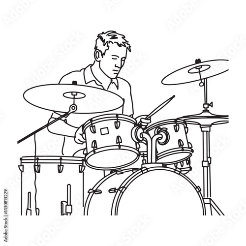 Vektorová ilustrace hudebníka bubeníka ve sluchátkách hrajícího bicí soupravu v rádiu. Radio people plochý designový prvek, ikona izolovaná na bílém pozadí.