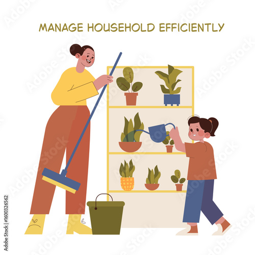 Vektorová ilustrace uklízečky nebo hospodyňky, která poslouchá rádio a mycí podlahy s houbovým mopem. Radio people plochý designový prvek, ikona izolovaná na bílém pozadí.