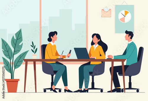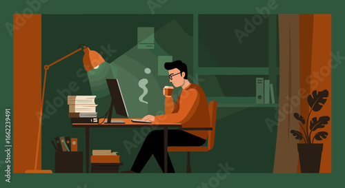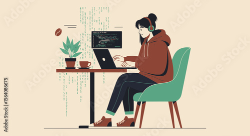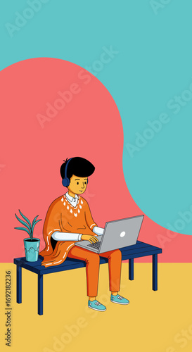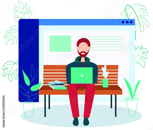 Vektorová ilustrace rozhlasového moderátora nebo dj male ve sluchátkách pracujících před mikrofonem a notebookem v rozhlasovém studiu. Vedení rozhlasové stanice nebo programu koncept plochý styl designový prvek.
