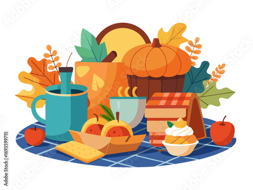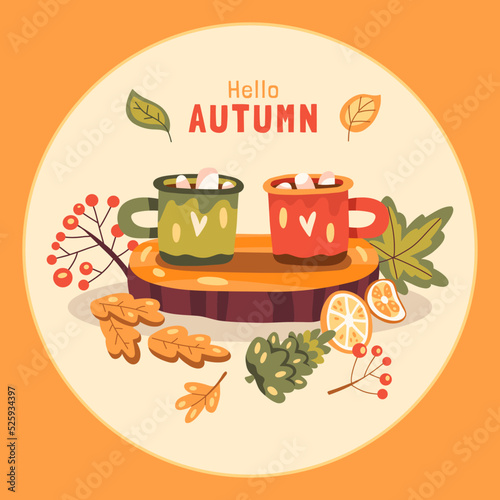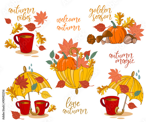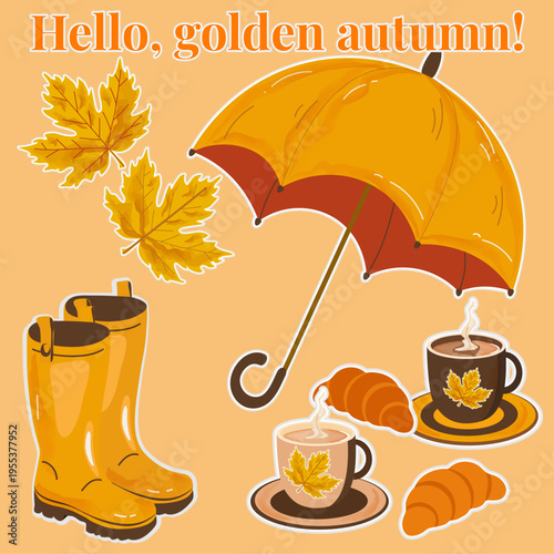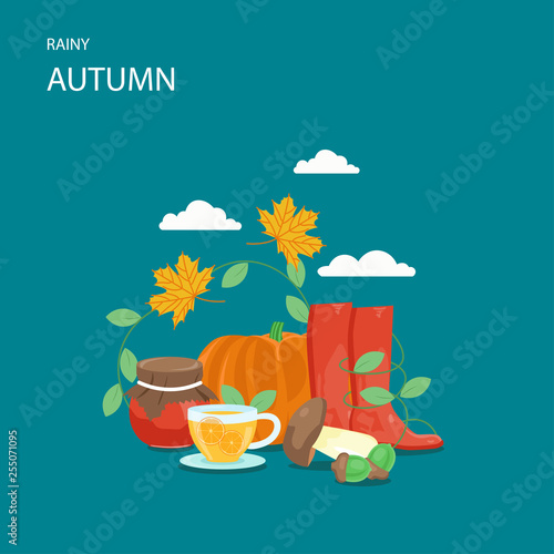 Deštivé podzimní vektorové plochý styl designu ilustrace. Jam jar, gumové holínky, mraky, dýně, žaludy, houby, listy a šálek čaje s citronem. Podzimní kompozice pro webový banner, webovou stránku atd.