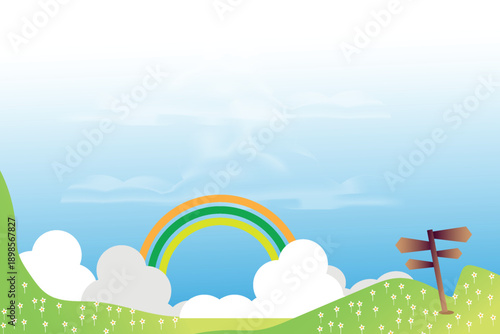 Deštivé mraky na obloze, krásná duha visící nad řekou, loď plovoucí na vodě, vektorové ilustrace v papírovém uměleckém stylu.