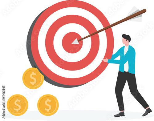 Malé postavy zaměřené na obrovský cíl, přilákat zákazníky magnetem, při pohledu přes dalekohled, plochý vektorový obrázek. Obchodní vize, dosažení cíle. Zvyšování graf růstu podnikání, úspěch.