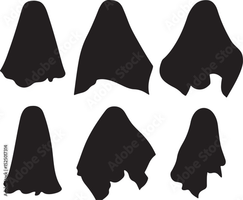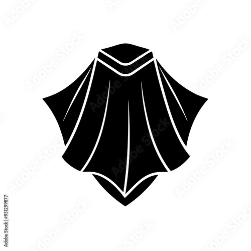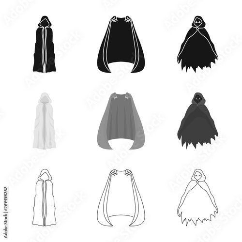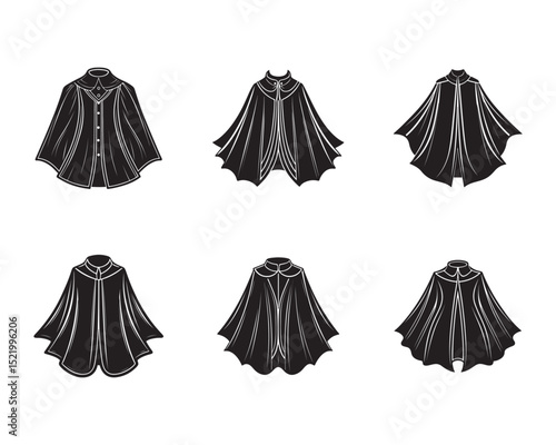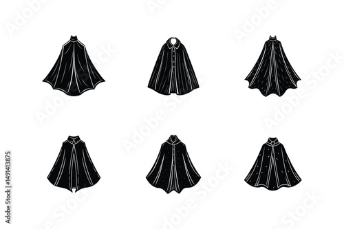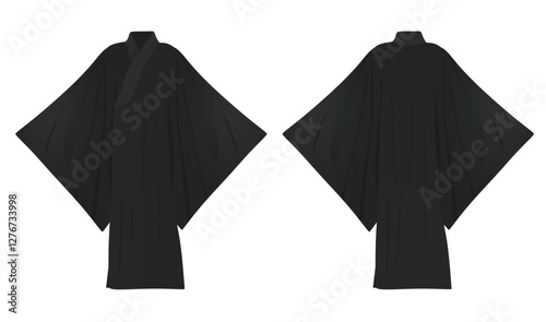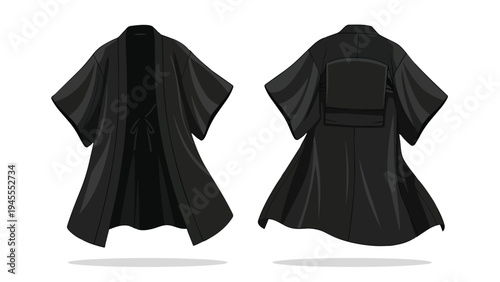 Černý hedvábný plášť, plášť, plášť, přední zadní a boční pohled, vektorové ilustrace izolovaných na bílém pozadí. Realistický karneval, maškarní oblečení, Halloween party kostým atd.