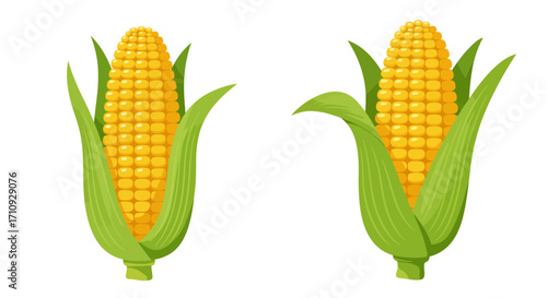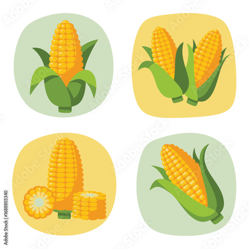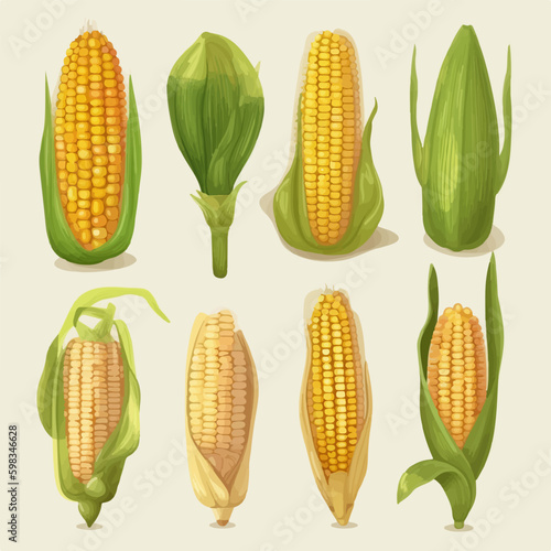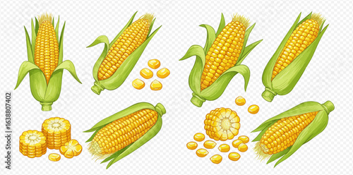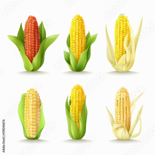 Realistické kukuřice set, vektorové ilustrace izolovaných na bílém pozadí. Zralé zlaté kukuřičné klasy a zrna. Sklizeň kukuřice, potravinářský průmysl, zemědělství.
