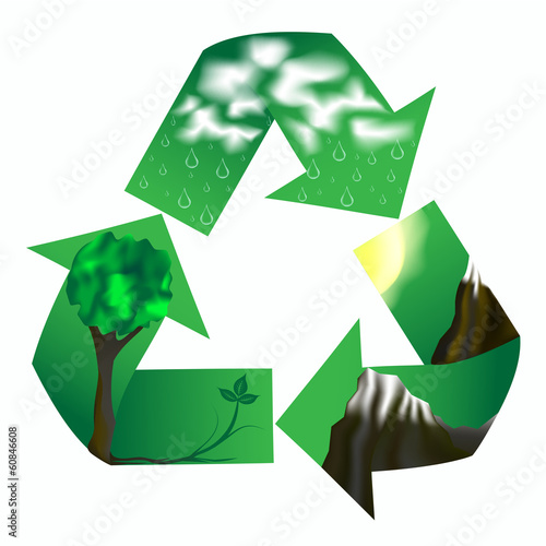 Recyklovat znamení s listy a květy uvnitř, vektorové ilustrace v papírovém uměleckém stylu. Ekologický symbol opětovného použití a recyklace odpadu, štítek.