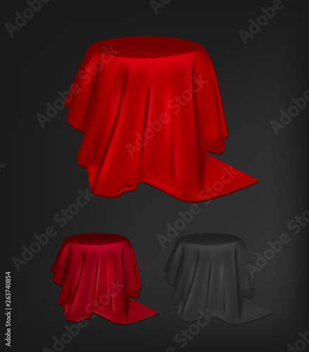 Červené látkové závěsy pokrývající jiný druh nábytku vektorové ilustrace. Hedvábná tkanina tkanina skrytí stůl, konferenční stolek, křeslo, pohovka gauč během Nového Příjezdu nebo prodeje prezentační akce