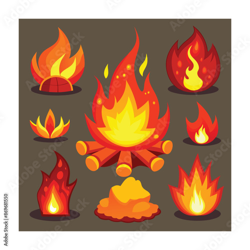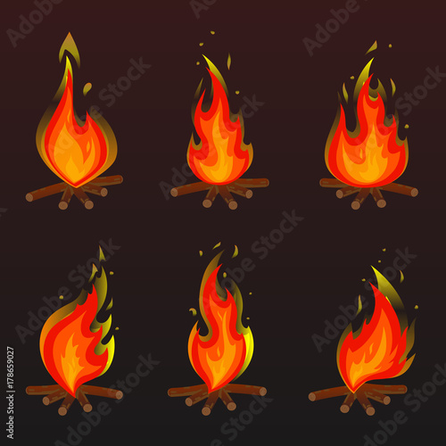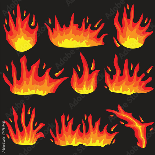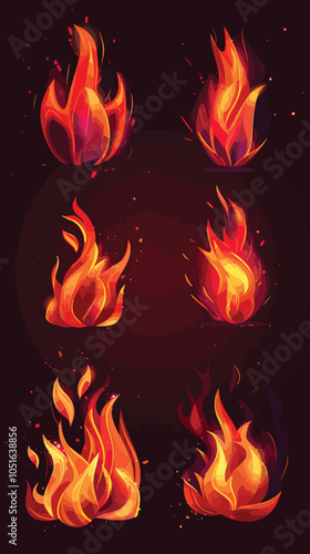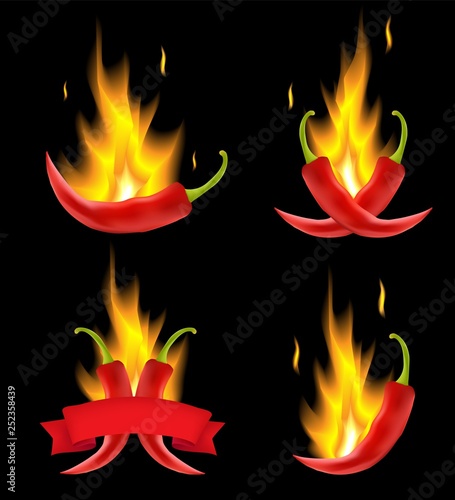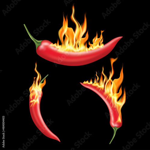 Sada Red hot chili pepper. Vektorové realistické ilustrace hořící chilli papričky v ohni. Koření používané k vaření k přidání tepla do pokrmů.