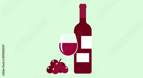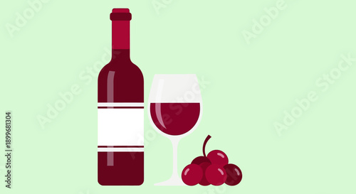Vektorová ilustrace láhve červeného vína a sklenice plné vína s vinnou révou. Alkoholický nápoj, oblíbený nápoj. Plochý design