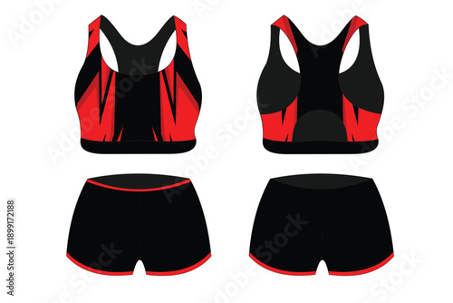 Červená dámská sportovní podprsenka nebo crop top a šortky maketa set, vektorové ilustrace, přední, zadní a boční pohled. Sportovní oblečení móda, tréninkové oblečení šablona.