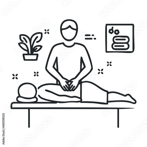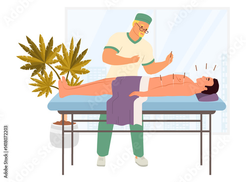Rehabilitační centrum. Masážní terapie, ploché vektorové ilustrace. Fyzioterapeutka dává masáž zad pacientovi ležícímu na stole. Rehabilitační a fyzioterapeutická léčba zraněných