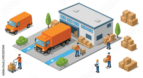 Relocation service web banner design šablony. Vektorové izometrické nákladní auto a pracovník vykládání lepenkových krabic. Koncept stěhování nebo přemístění.