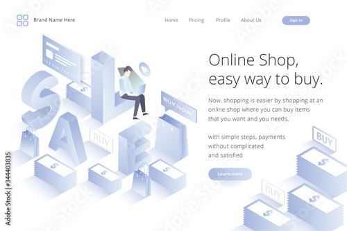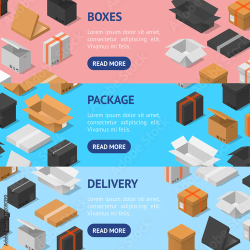 Relocation service vector website template, web page and landing page design for website and mobile site development. Pracovník tlačí vozík s kartonovými krabicemi. Koncept stěhování nebo přemístění.