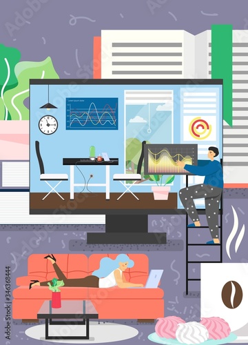 Mužské a ženské postavy pracující z domácí kanceláře, vektorový plochý design ilustrace. Práce na dálku, na volné noze, podnikatelé v karanténě, zůstat doma, izolace kvůli pandemii koronavirů
