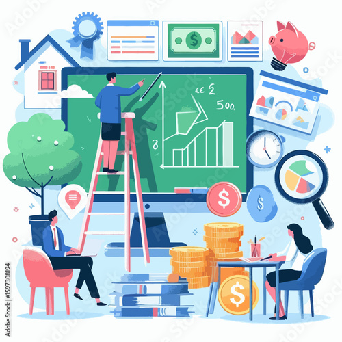 Obnovitelné znamení, přesýpací hodiny, lidé rostoucí zelené klíčky, plochá vektorová ilustrace. Obnovitelné zdroje, zelená energie.