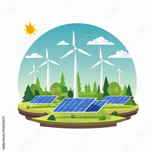 Koncept obnovitelné energie vektorový plochý obrázek. Planeta Země, Větrné mlýny s elektrickou zástrčkou. Větrné turbíny, které přeměňují větrnou energii na elektrickou energii. Alternativní ekologická energie.
