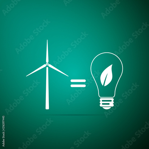 Koncept obnovitelné energie vektorový plochý obrázek. Větrné mlýny větrné turbíny a zelené stromy uvnitř žárovky. Alternativní zdroj větrné energie. Ochrana ekologie a ochrana životního prostředí