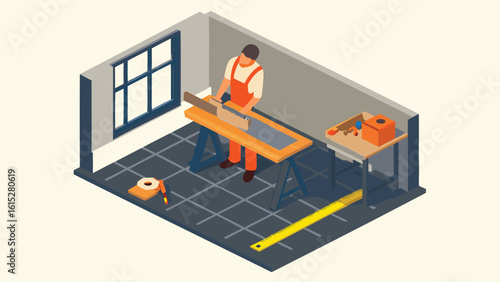 Renovace posádky vektorové ploché izometrické zobrazení řezu ilustrace. Odřízněte interiér domu s pracovníky, kteří malují stěny, instalují laminátové a elektrické zásuvky.