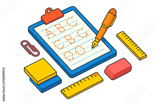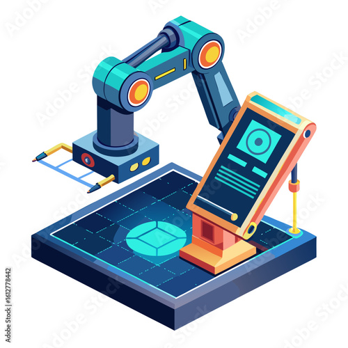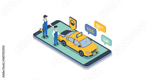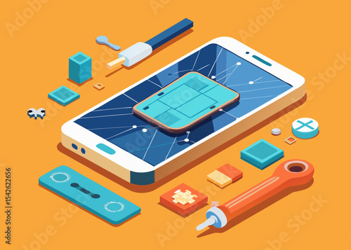 Plán renovace na smartphonu vektorové ploché izometrické ilustrace. Smartphone s plánem domu na obrazovce a sadou nástrojů pro opravy domů kolem něj.