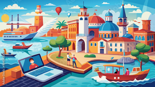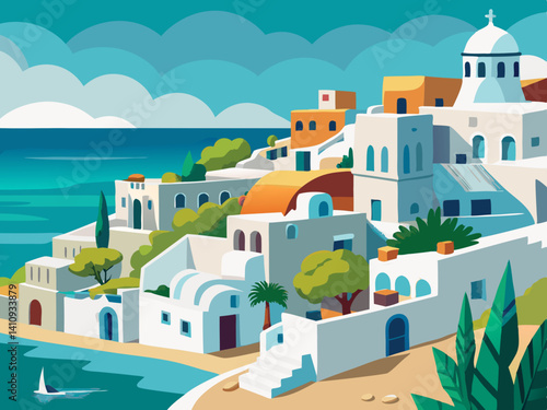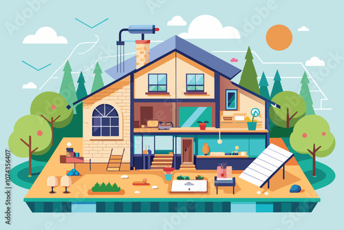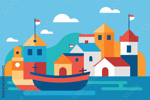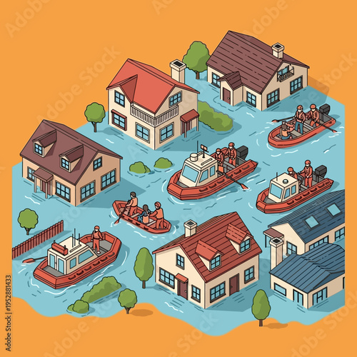 Záchranný tým zachraňující oběti povodní vektorové ilustrace. Povodňová scéna s plovoucím dopravním vozidlem ve vodě a ponořenými domy