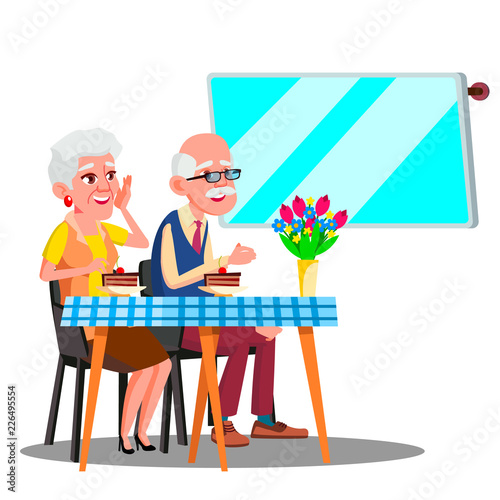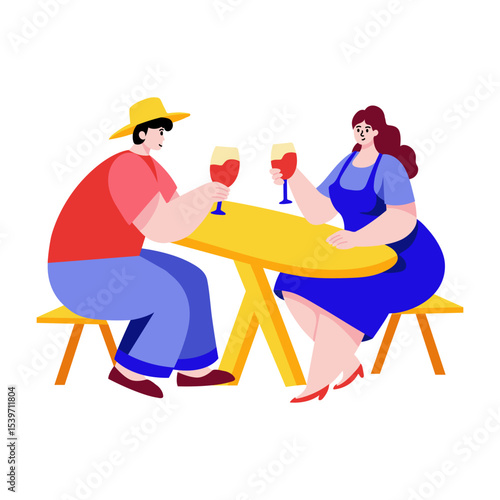 Romantický pár sedí u stolu v restauraci a pije šampaňské, vektorová plochá ilustrace izolovaná na bílém pozadí. Restaurace catering podnikání.