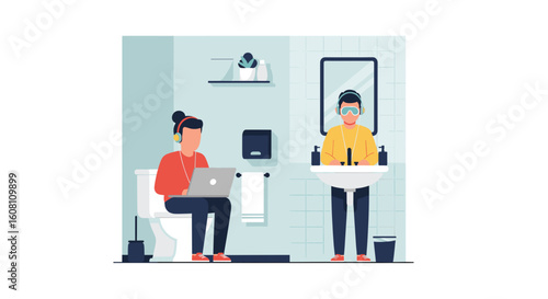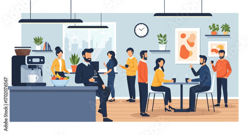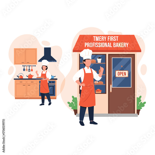 Restaurace kuchař kuchař a číšník v uniformě, kuchyňské spotřebiče a nádobí, vektorové ploché ilustrace. Komerční restaurace kuchyně s mužskými a ženskými postavami vaření jídla, drží stříbrnou misku.