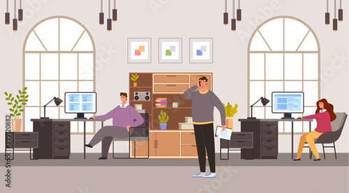 Komerční kuchyňský personál, ploché vektorové ilustrace. Kuchař postavy krájení zeleniny, smažení masa, cukrář vaření dezertů, číšník servírování jídel. Týmová práce v restauračním průmyslu, stravování.