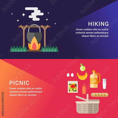 Restaurační služby vector flat style design ilustrace. Stolní nádobí, svíčky, sklenice na víno, stolní ubrousek, kytice květin. Koncept stravovacích služeb kavárny pro webový banner, webovou stránku atd.