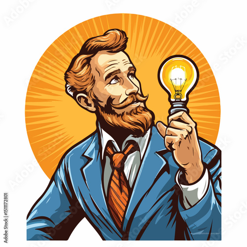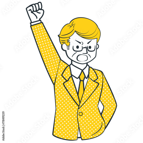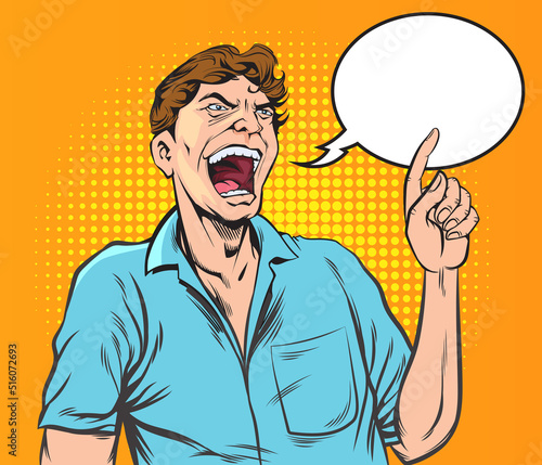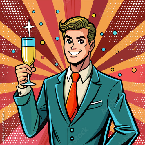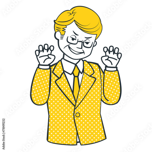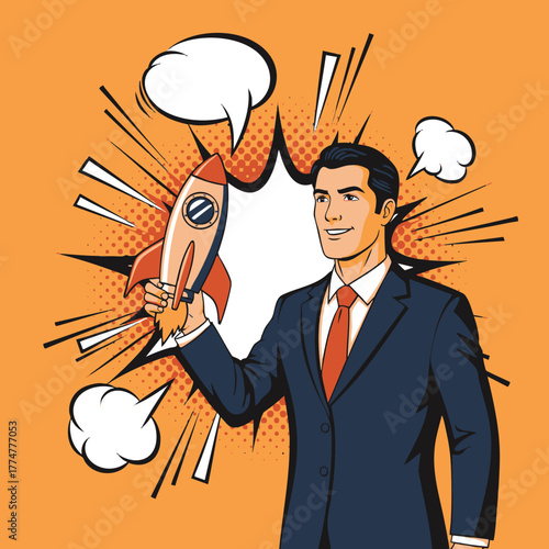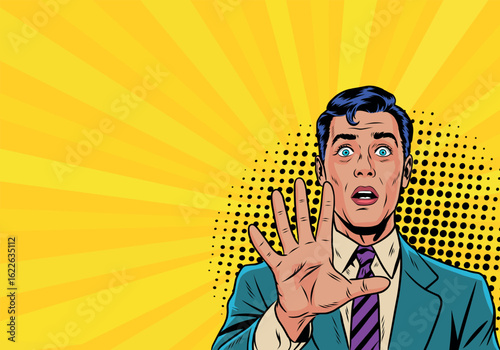 Bohatý pohledný chlap držet peníze a ukázat prstem nahoru. Obchodní a finanční koncept vektorové ilustrace v retro komiksovém stylu pop art.