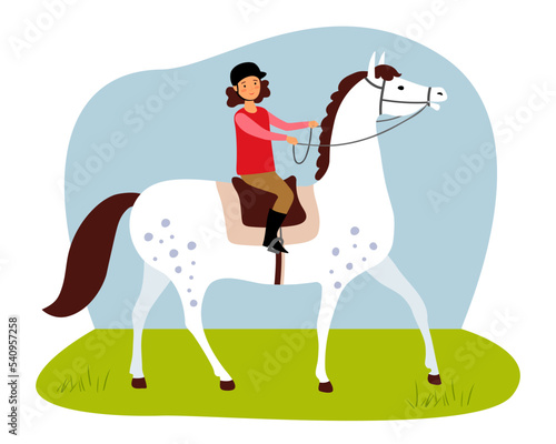 Vektorová ilustrace mladé ženy na bílém půvabném koni. Jízda na koni concept designový prvek v plochém stylu.