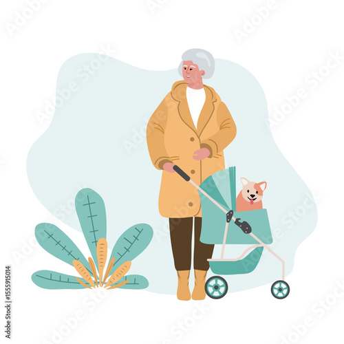 Robot asistent sloužící jídlo pro starší ženy vektorové scény. Inteligentní AI mechanický pečovatel pomáhá zdravotně postiženým seniorským postavám. Cyborg školník futuristické technologie