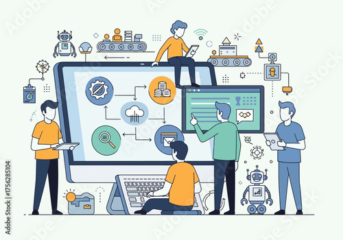 Vektorové ilustrace malých lidí inženýrů vytváření velkého robota. Inženýrství, programování robotiky, robotický software, koncept automatizace robotických procesů pro webový banner, webovou stránku atd.