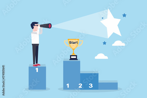 Robot stroj lezení kariérní žebřík s trofej pohár a vlajka na vrcholu, ploché vektorové ilustrace. Umělecký kariérní růst inteligence, vedení.