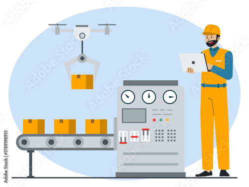 Robot balení balík na dopravníku vektorové ikony izolovaných na bílém pozadí. Proces automatizace skladu