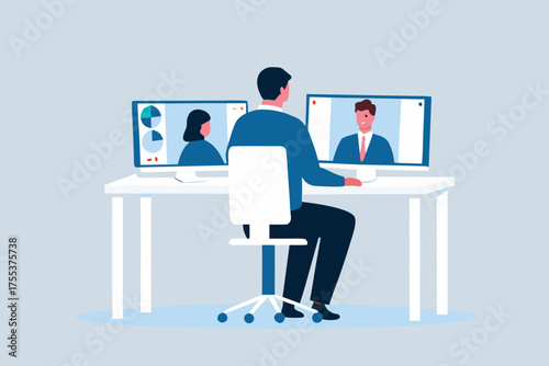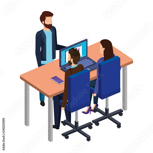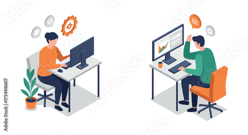 Vliv robotické automatizace na koncept lidské zaměstnanosti vektorová izometrická ilustrace. Roboti nahrazují lidské pracovníky. Roboti vs. lidská práce.