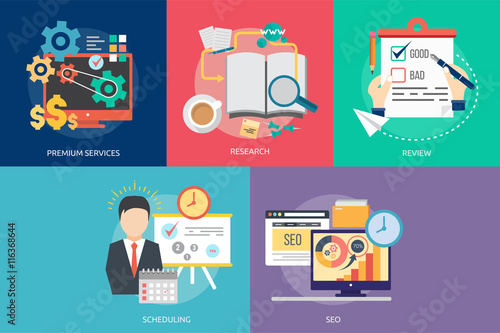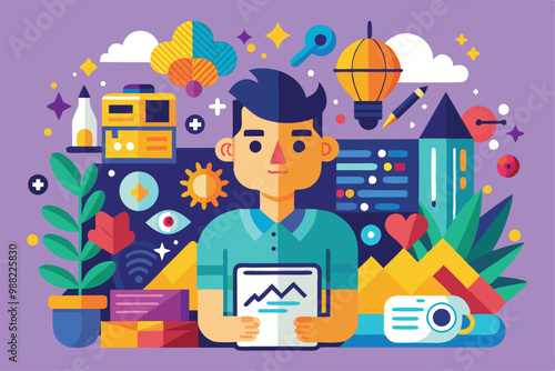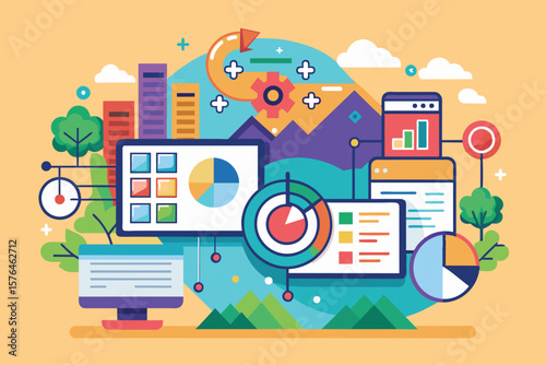 Robotika vektorová plochá ilustrace. Robot, průmyslové robotické rameno, grafy, grafy dashboard, klávesnice, dolarové mince, flash disky. Koncept automatizace obchodních procesů pro webový banner, webovou stránku atd.