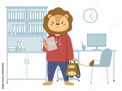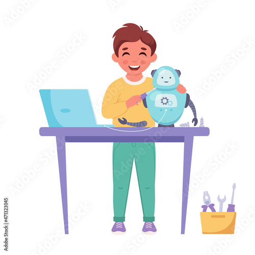 Robotická škola pro děti. Chytrý chlapec student dělat robot, ploché vektorové ilustrace. Kids robotics engineering.