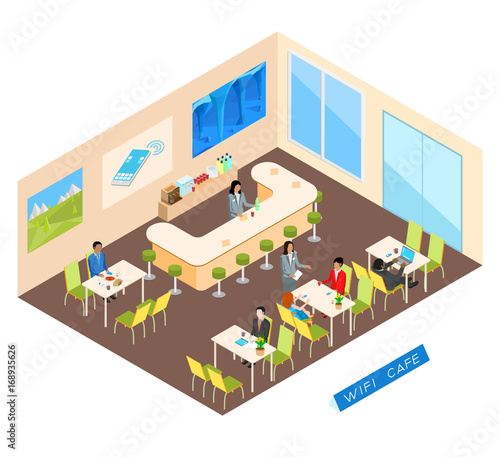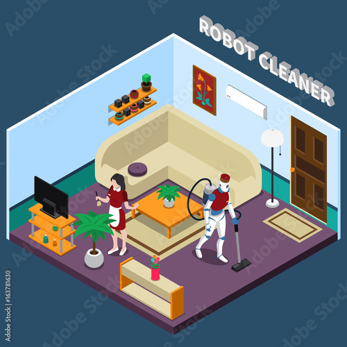 Šablona výstavy Robots event. Vektorová izometrická ilustrace robotů reklamní realizace zboží nebo služeb pomocí propagačních pultů, stojanů, vlajkových bannerů.