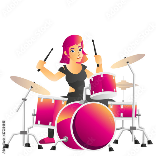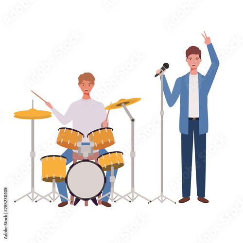 Rocková kapela kreslené postavičky zpěv písně přehrávání hudby izolované set. Vzrušený muž A Žena lidé vystupující s hudebními nástroji vektorové ilustrace. Sólista, kytarista, bubeník
