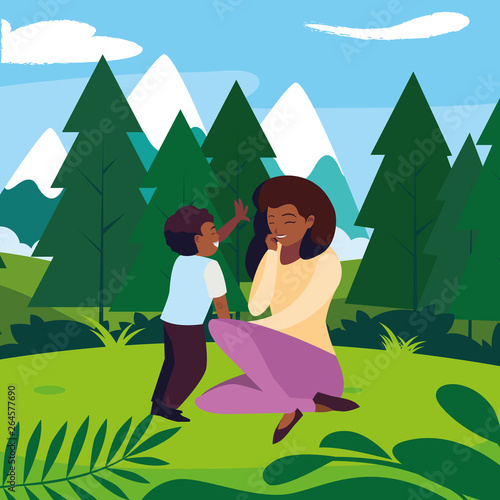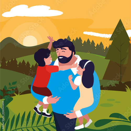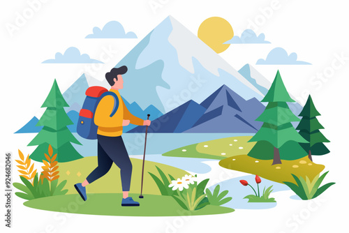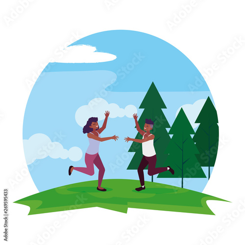 Romantický pár sedí u ohně v lese, ploché vektorové ilustrace. Šťastní turisté chodí kempovat, turistika, trekking. Lesní tábor, piknik, letní outdoorové aktivity.