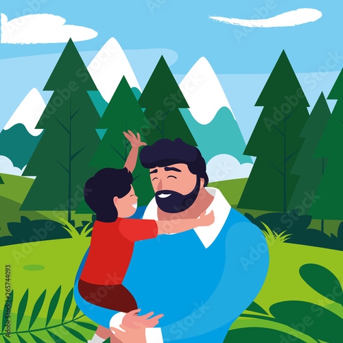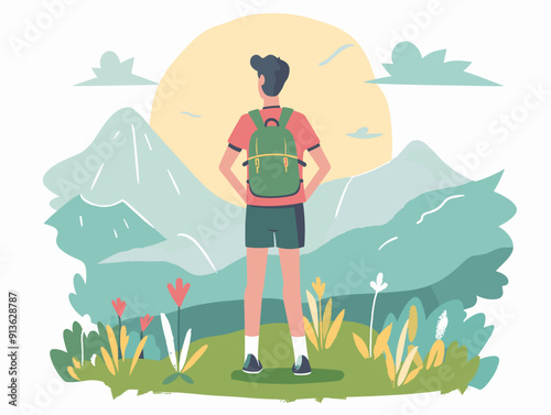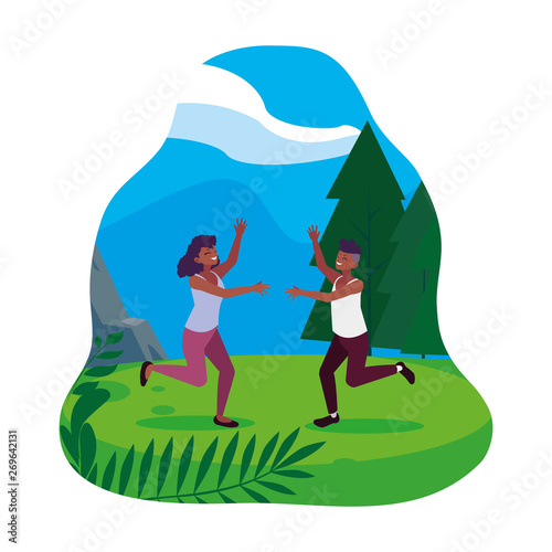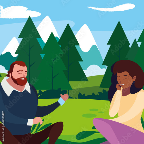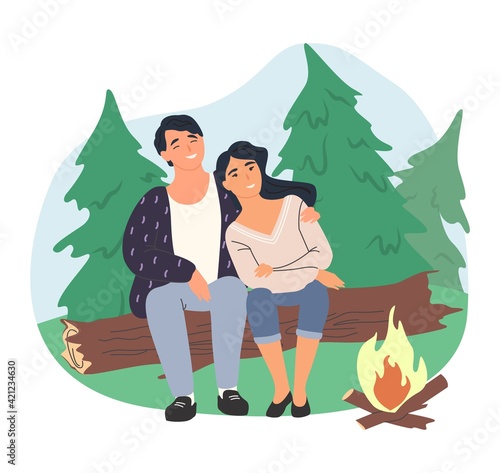 Romantický pár sedí u ohně v lese, ploché vektorové ilustrace. Šťastní turisté chodí kempovat, turistika, trekking. Lesní tábor, piknik, letní outdoorové aktivity.